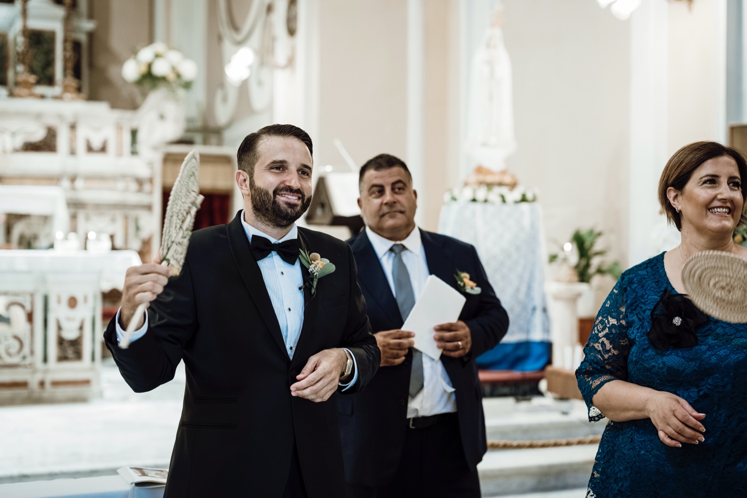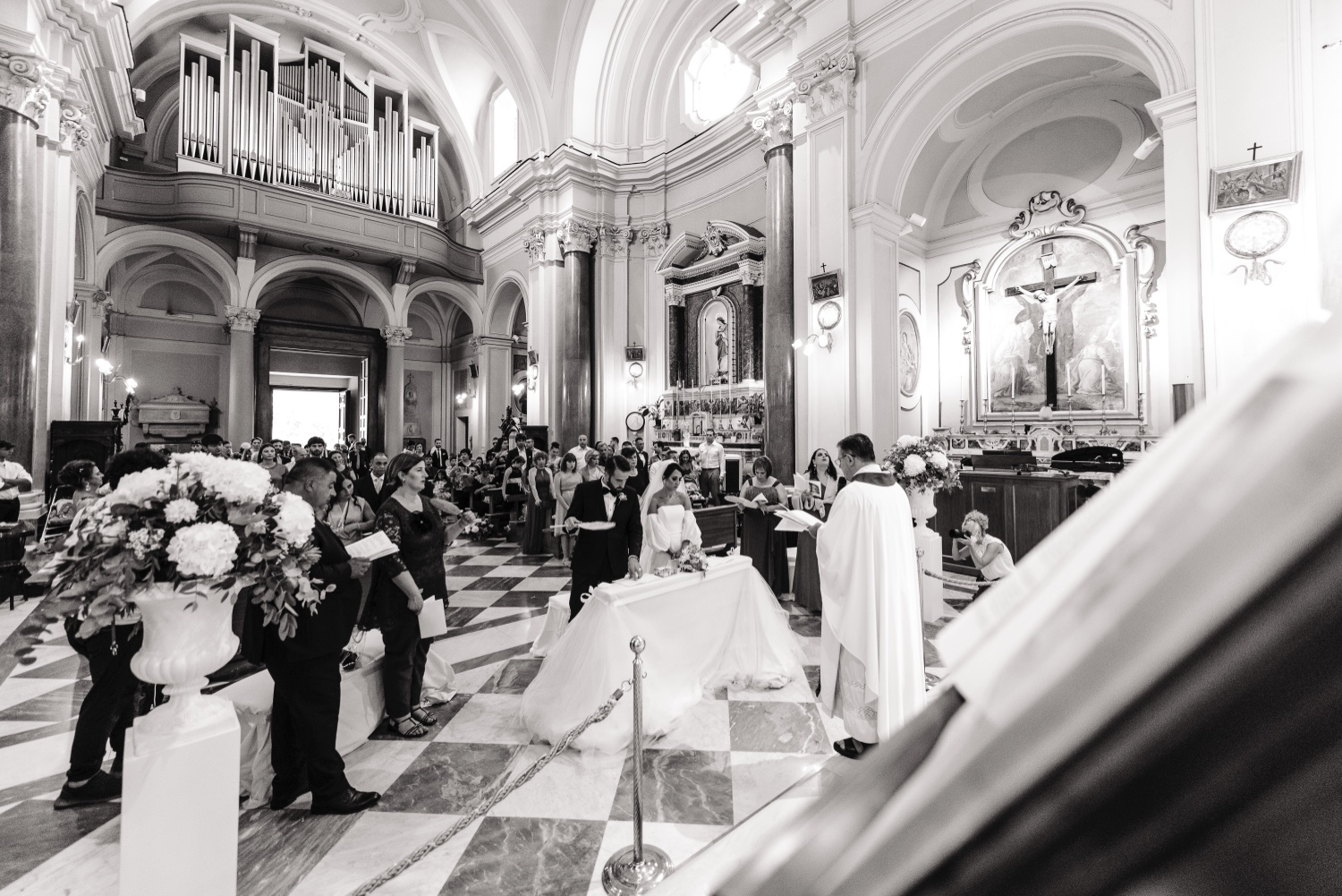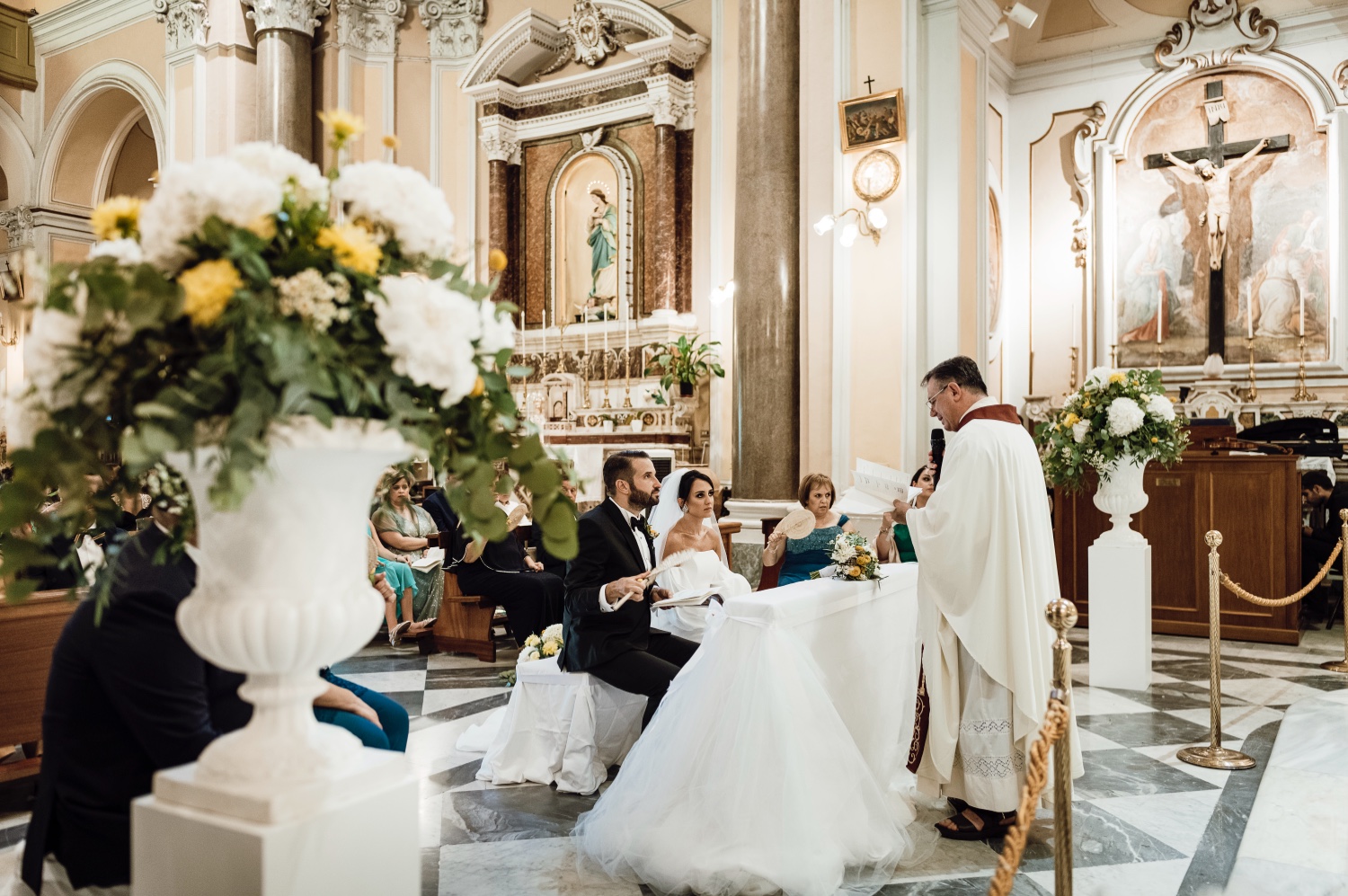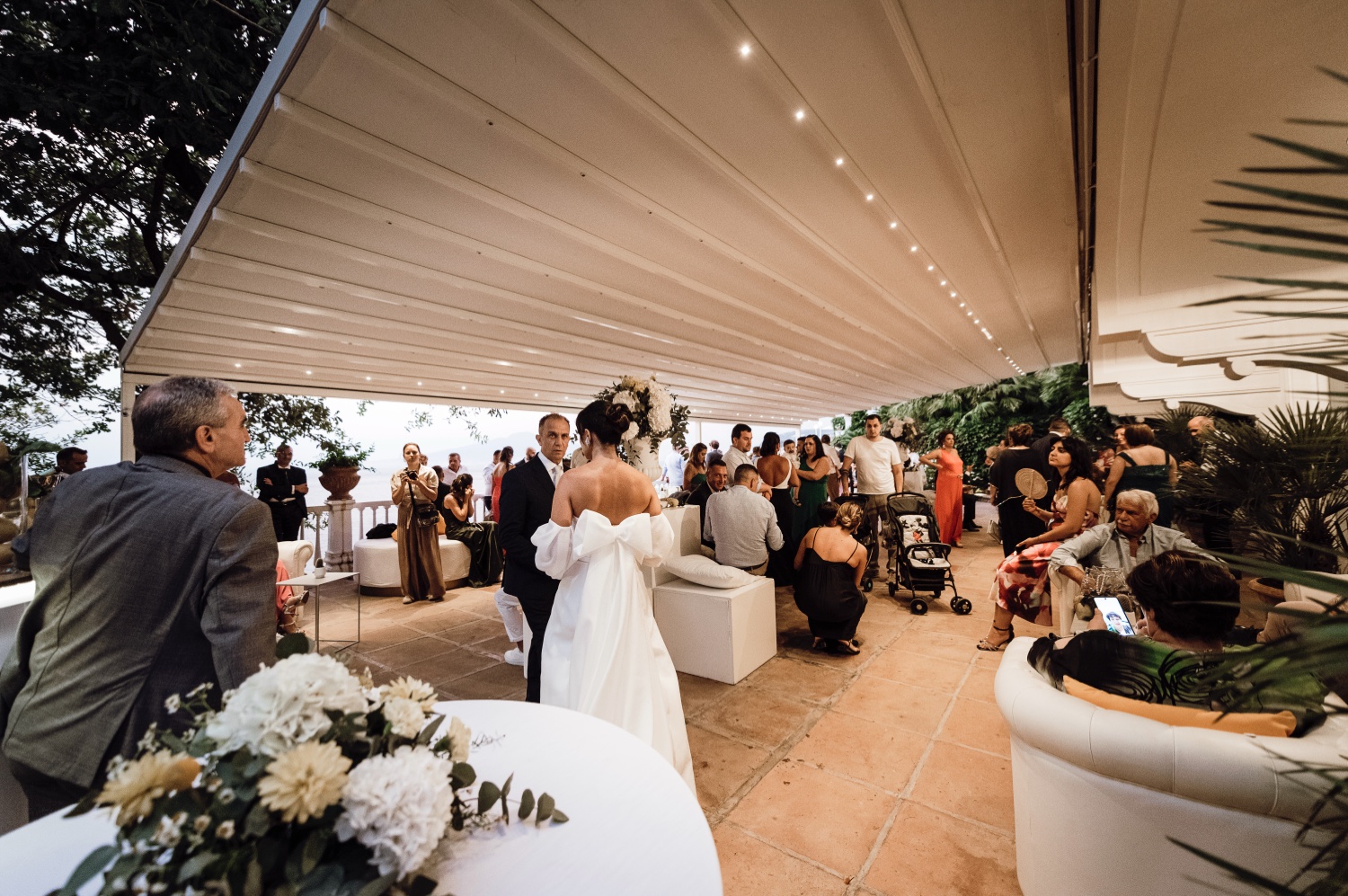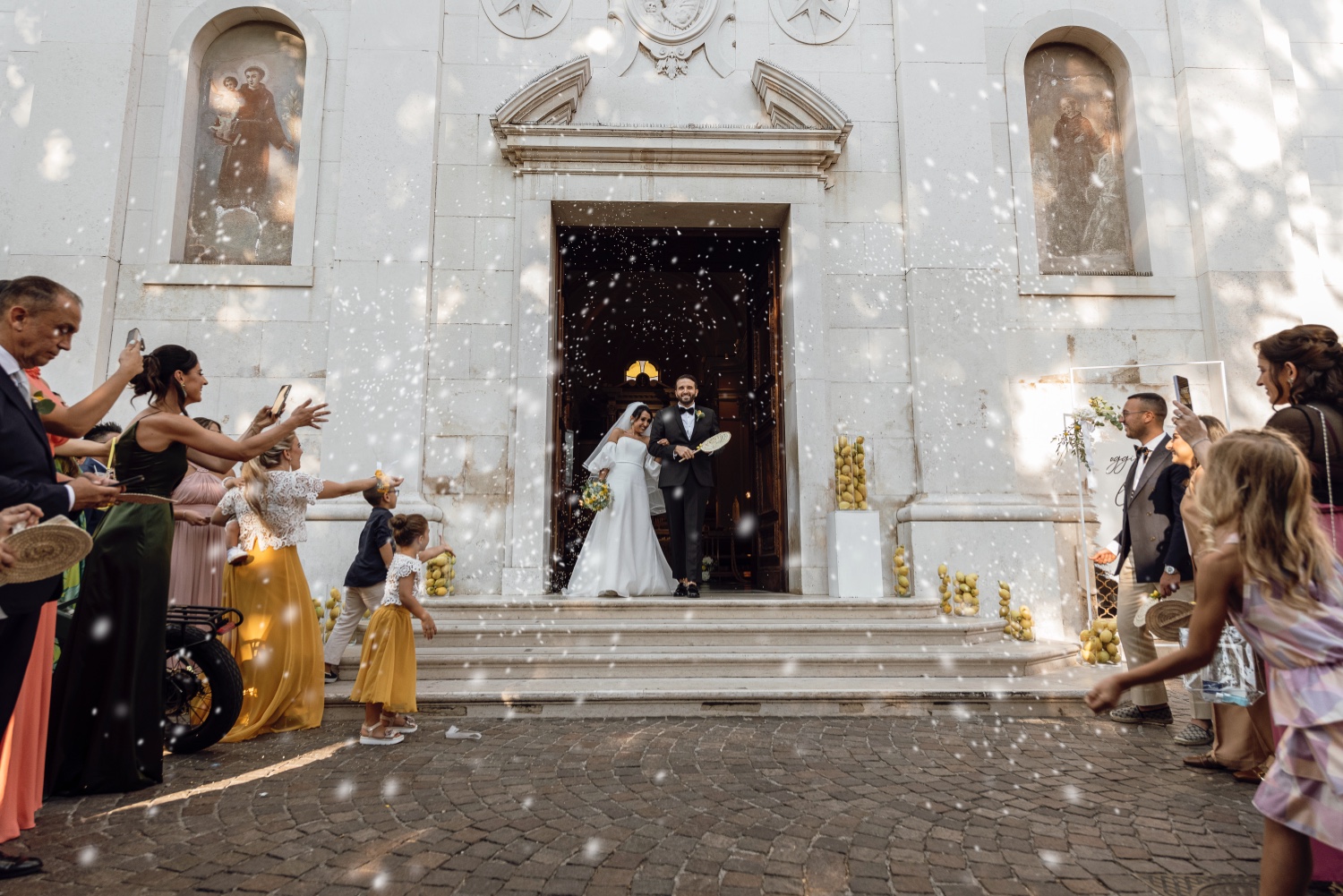 La location prescelta, la splendida Villa Silvana con la sua vista mozzafiato sul golfo di Sorrento, ha fornito lo sfondo perfetto per questo giorno speciale. La cerimonia, tenuta nella suggestiva chiesa di San Francesco, è stata contraddistinta dalla premura degli sposi che hanno accolto gli ospiti con un tipico carretto di limonate, regalando un momento di ristoro in una calda giornata di agosto.