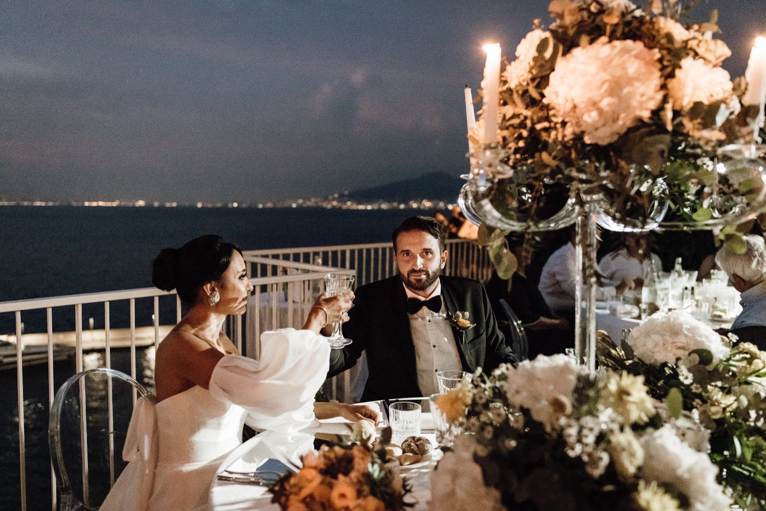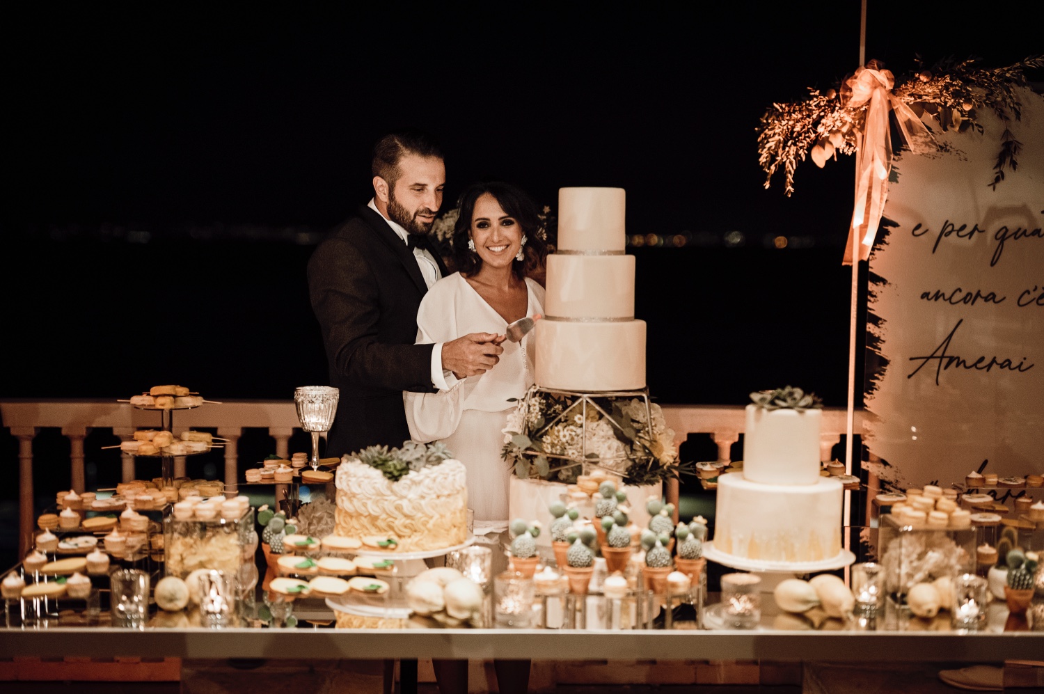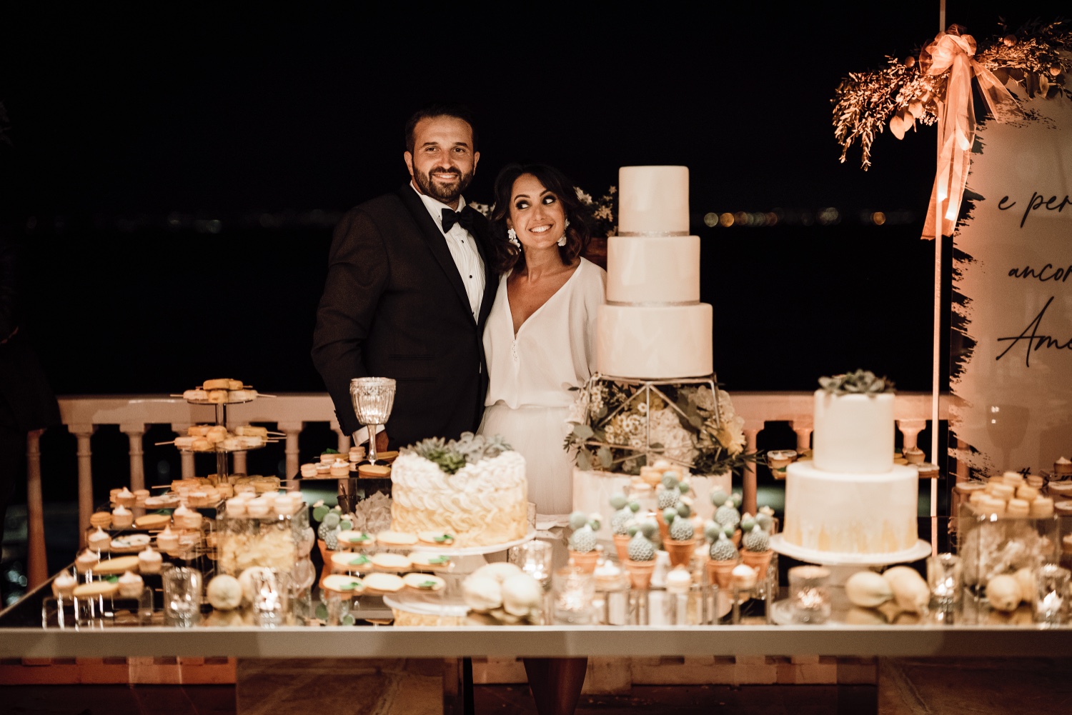The reception and gourmet dinner, organized by MDS Ricevimenti and entirely based on marine delicacies, delighted those present in a magical atmosphere illuminated by candles and with the backdrop of the sea.