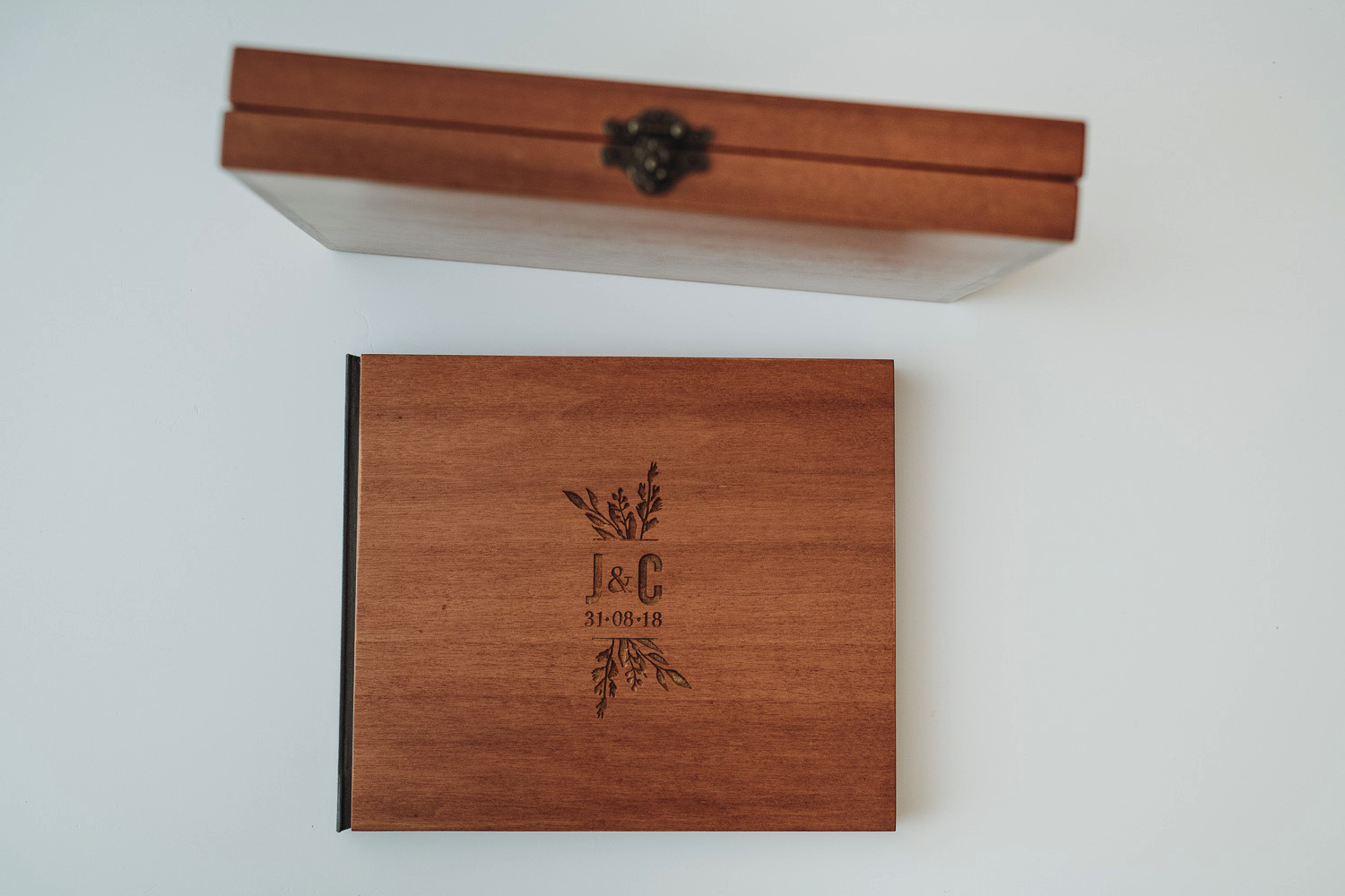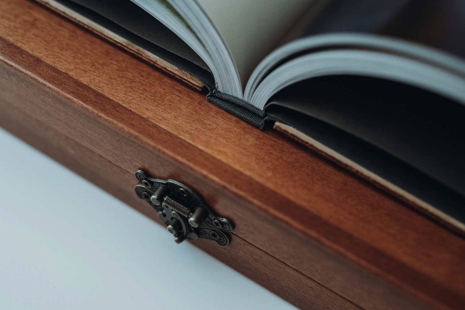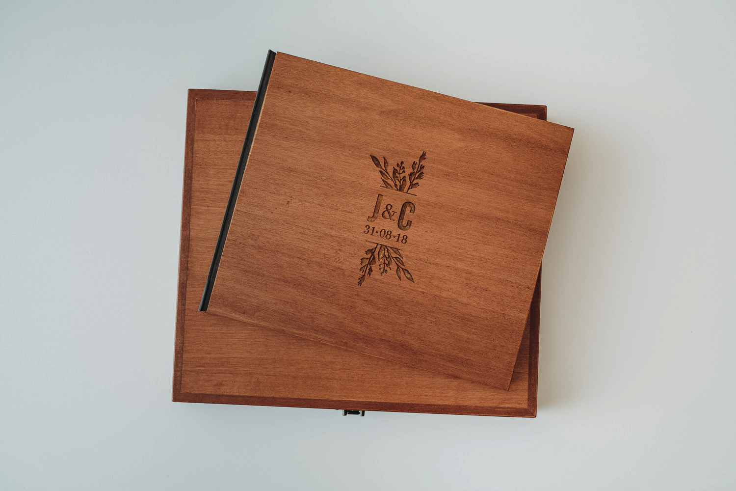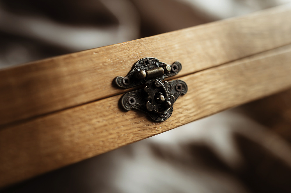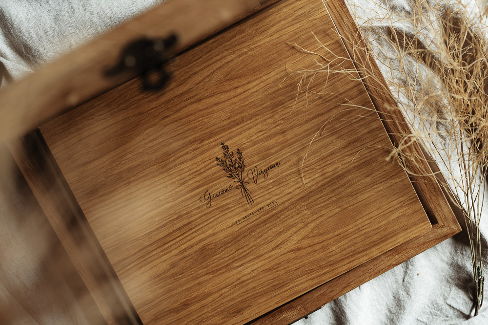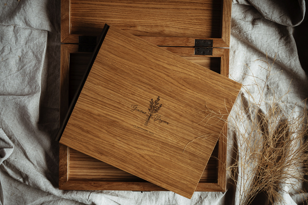 Lo scrigno custodisce il racconto del vostro matrimonio nella sua scatola a doppia anta fermata da un bastoncino di legno. Un gesto armonioso svela il libro dei ricordi preziosi.