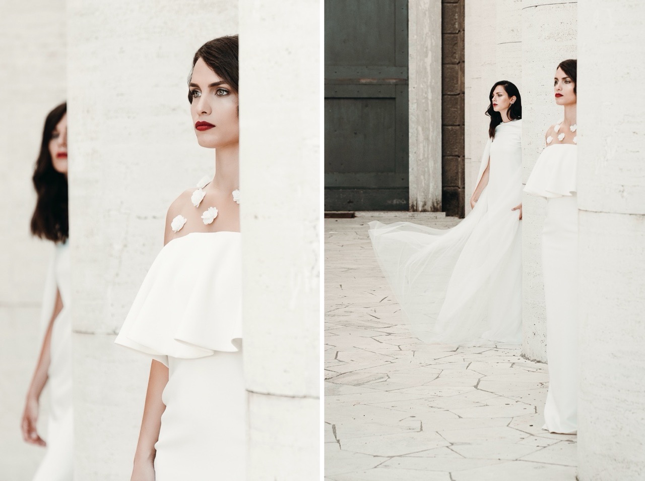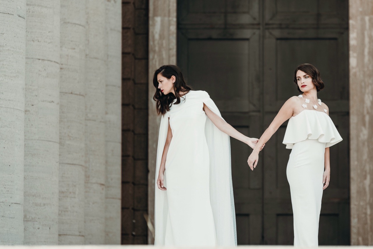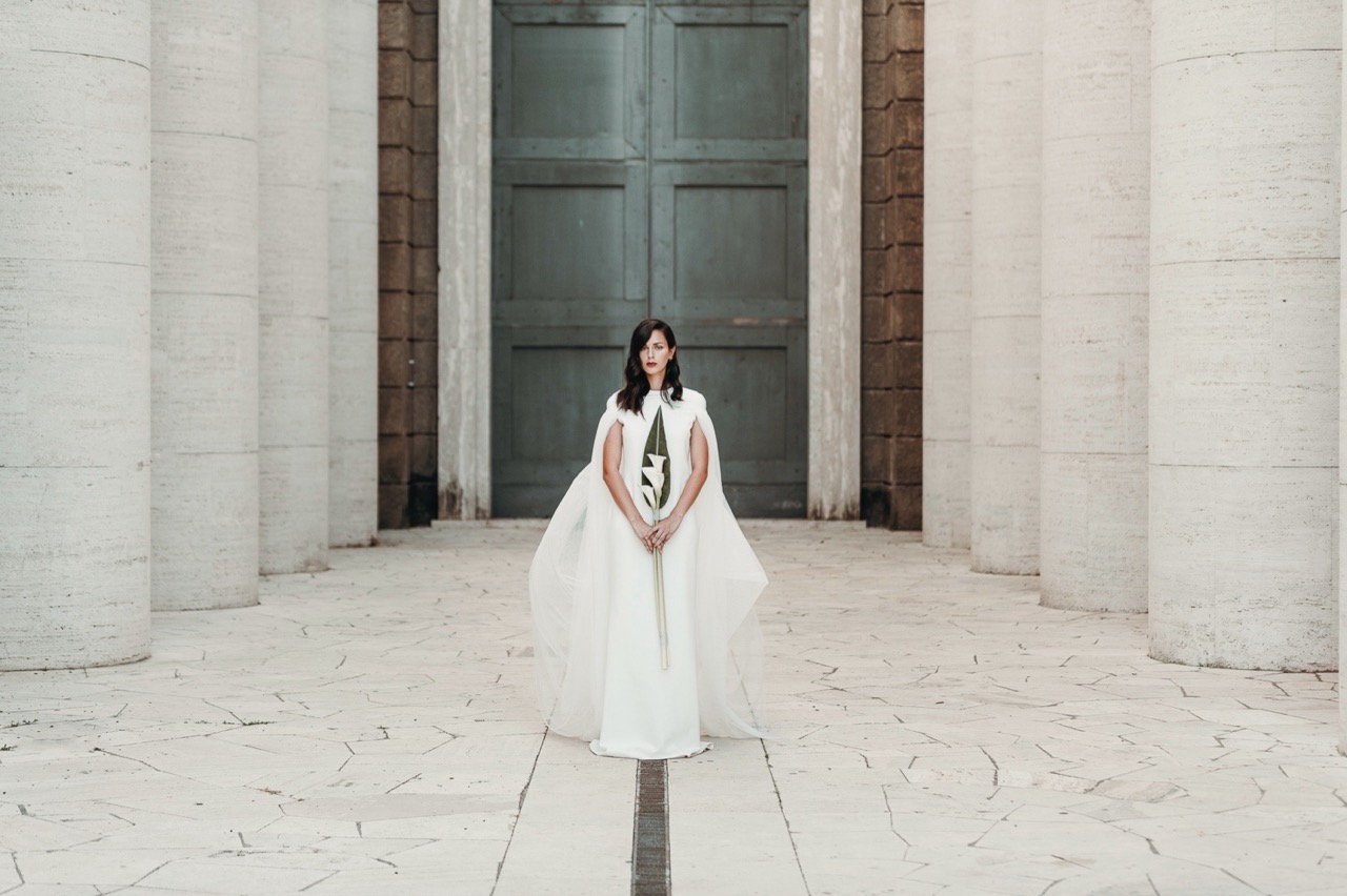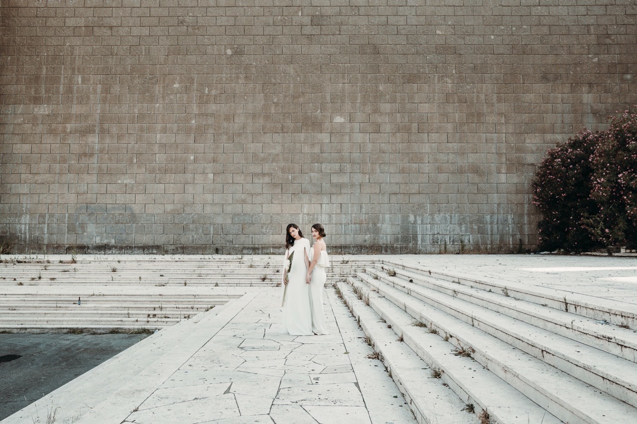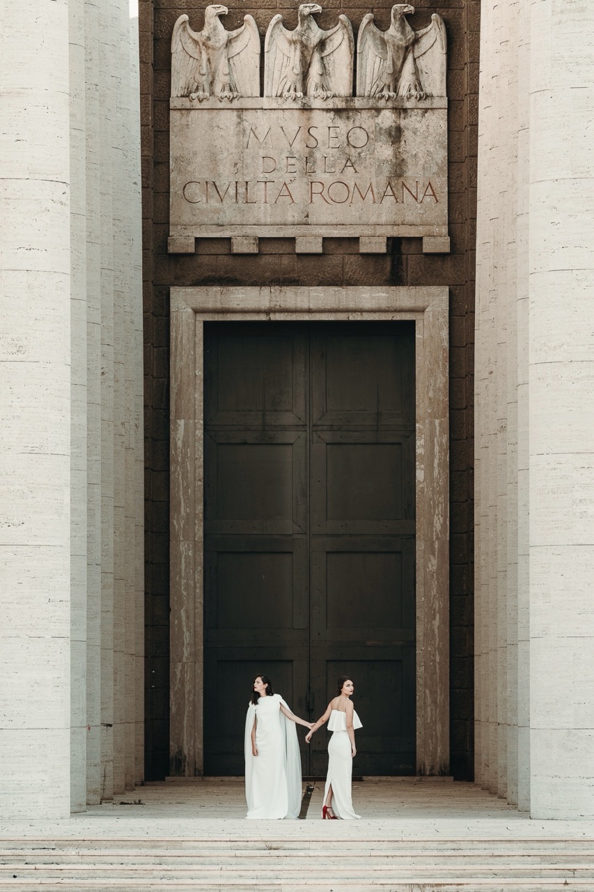 Two brides, immersed in a Rome less known but authentic in their formal rigor, which embodies the geometric cuts of her architecture, lights and shadows, elements and materials of Tamara’s pictorial style and of her era.