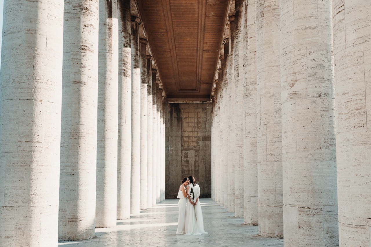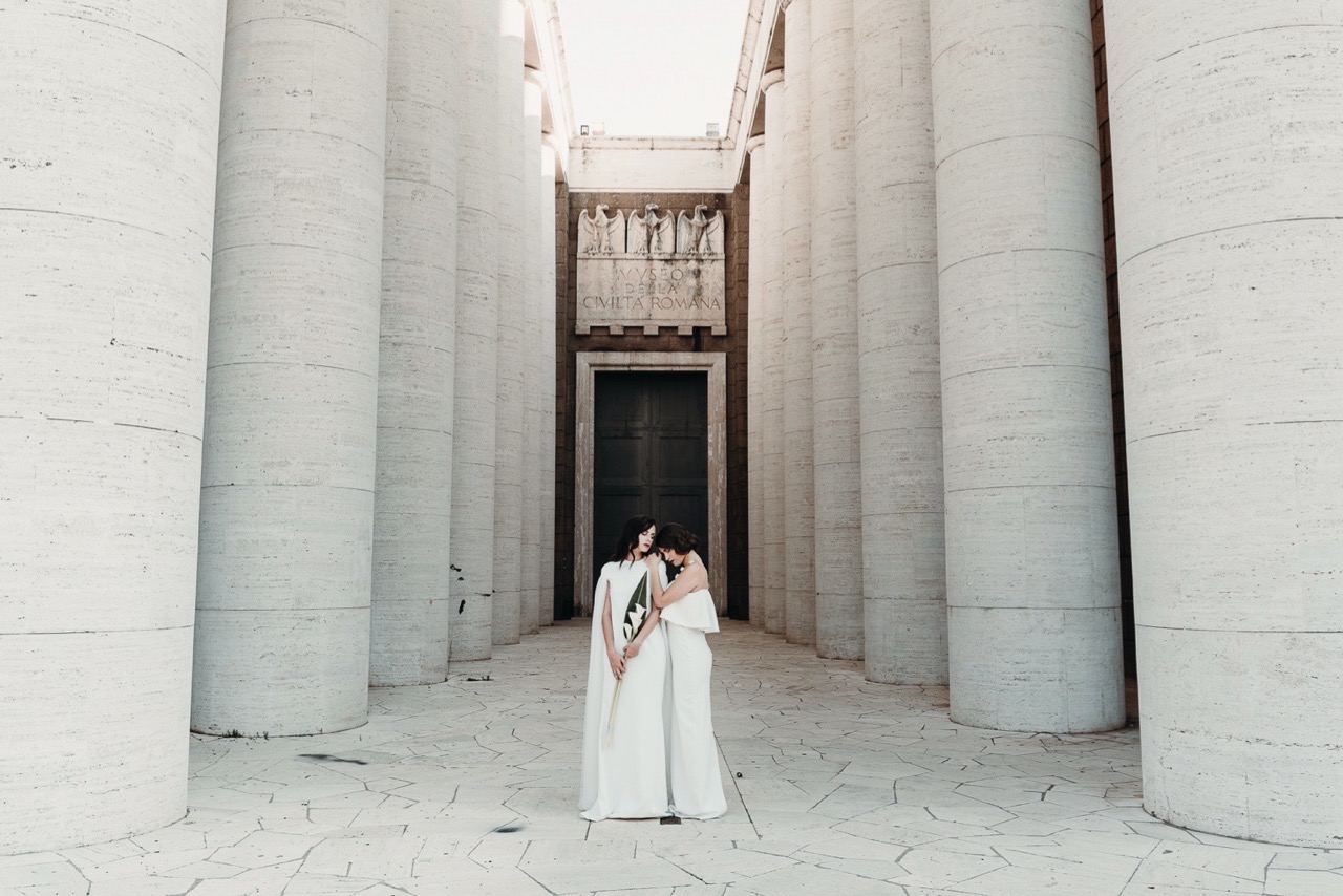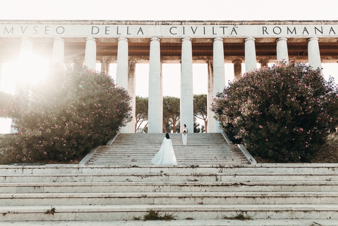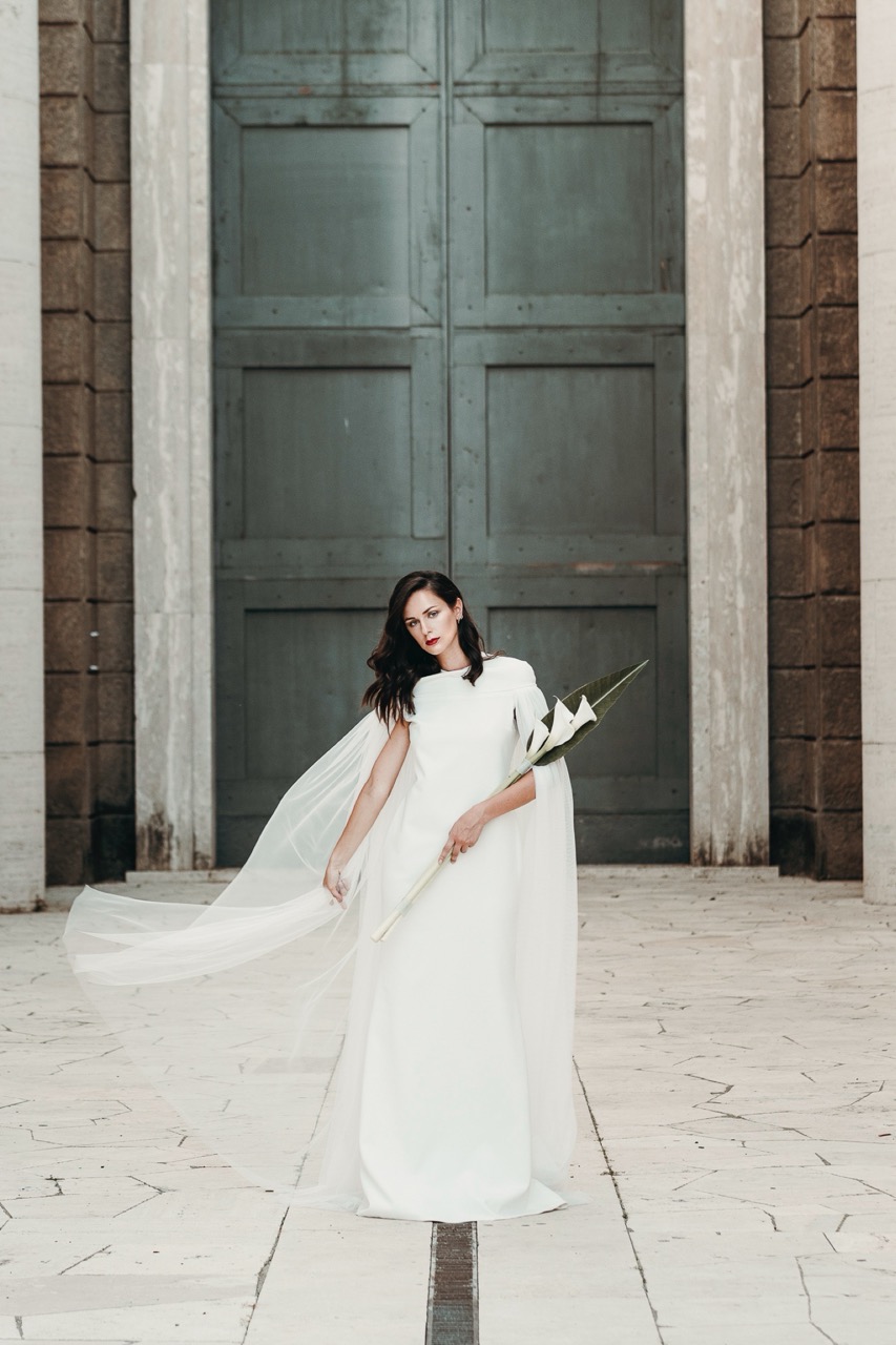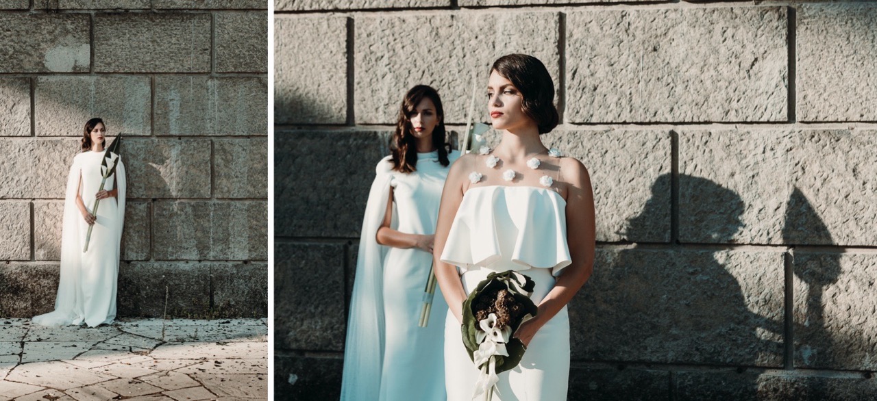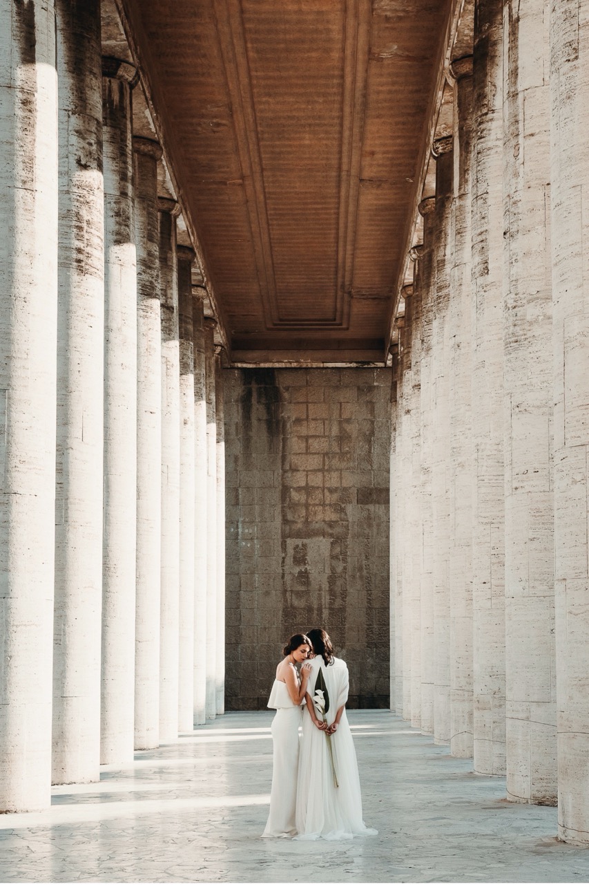 Two brides, immersed in a Rome less known but authentic in their formal rigor, which embodies the geometric cuts of her architecture, lights and shadows, elements and materials of Tamara’s pictorial style and of her era.