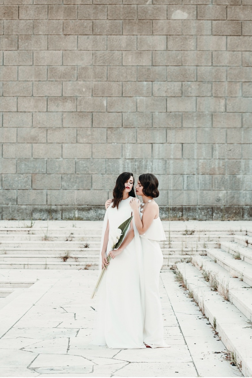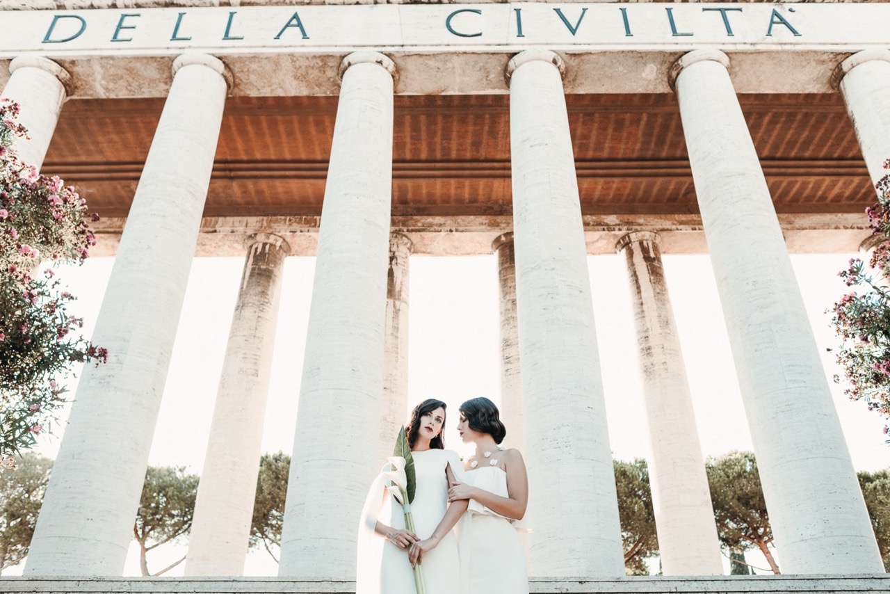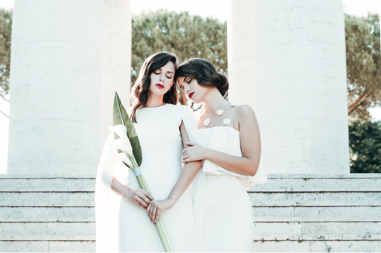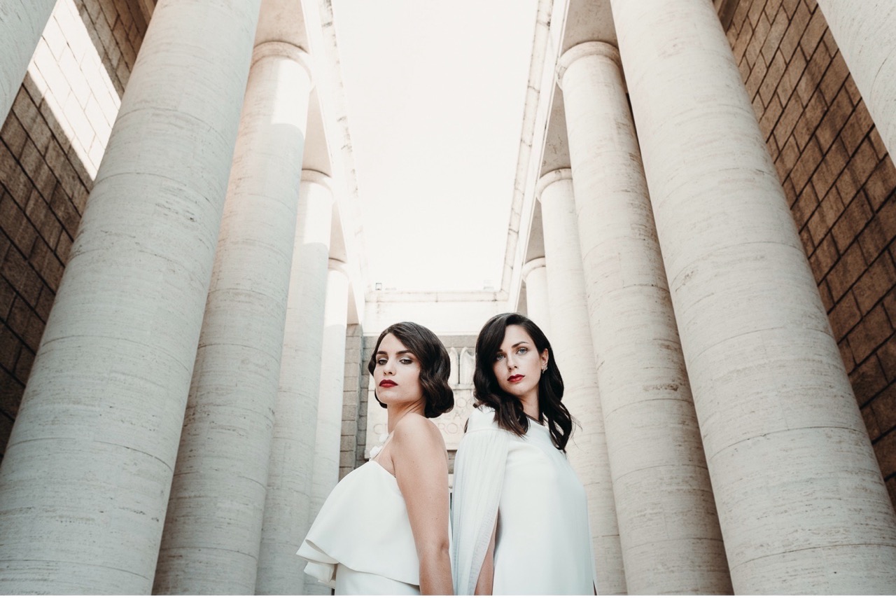 Due spose, immerse in una Roma meno conosciuta ma autentica nel loro rigore formale, che incarna i tagli geometrici della sua architettura, luci e ombre, elementi e materiali dello stile pittorico di Tamara e della sua epoca.