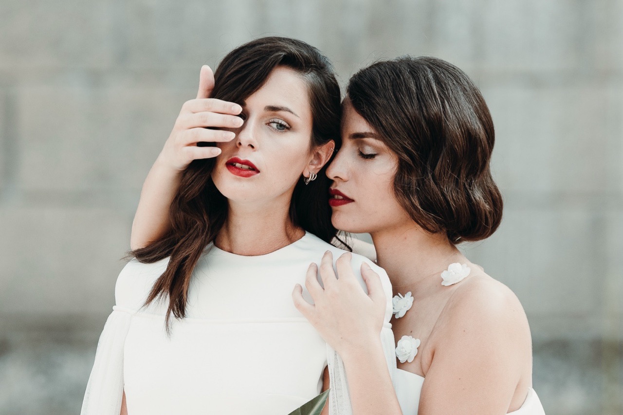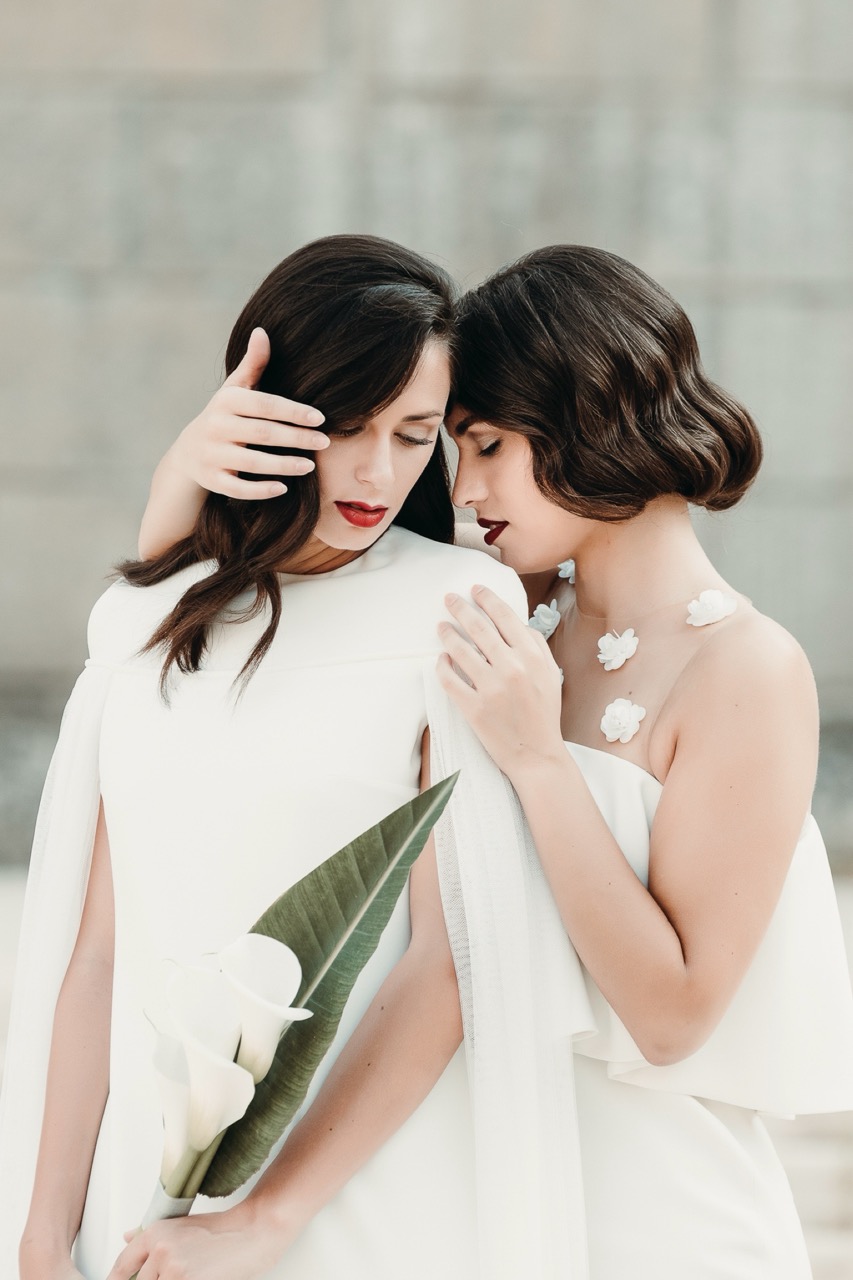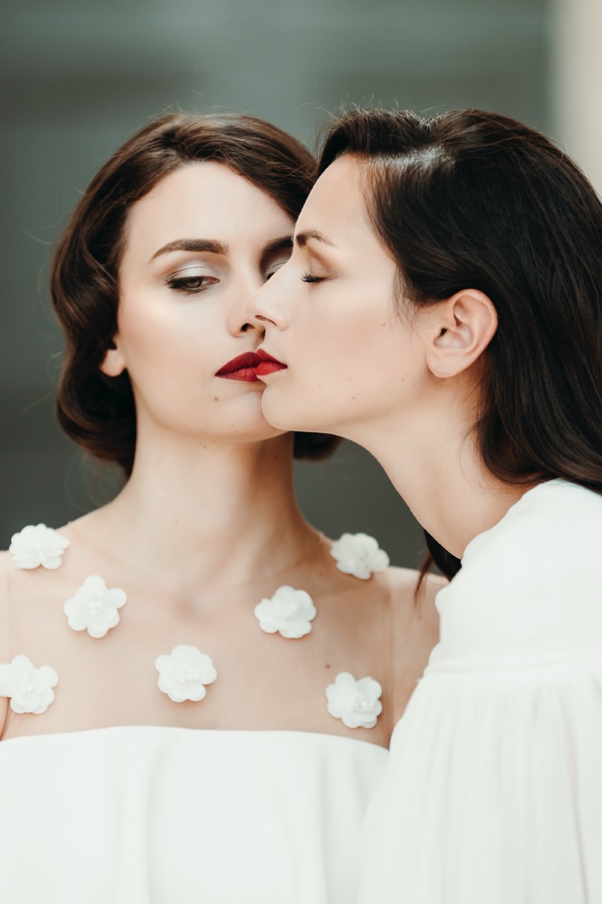 The two brides have retro hair and makeup designed and created by the talented Marianna Zambenedetti. Skin stands out with the bright red of the lips which fades and becomes natural in the interiors.