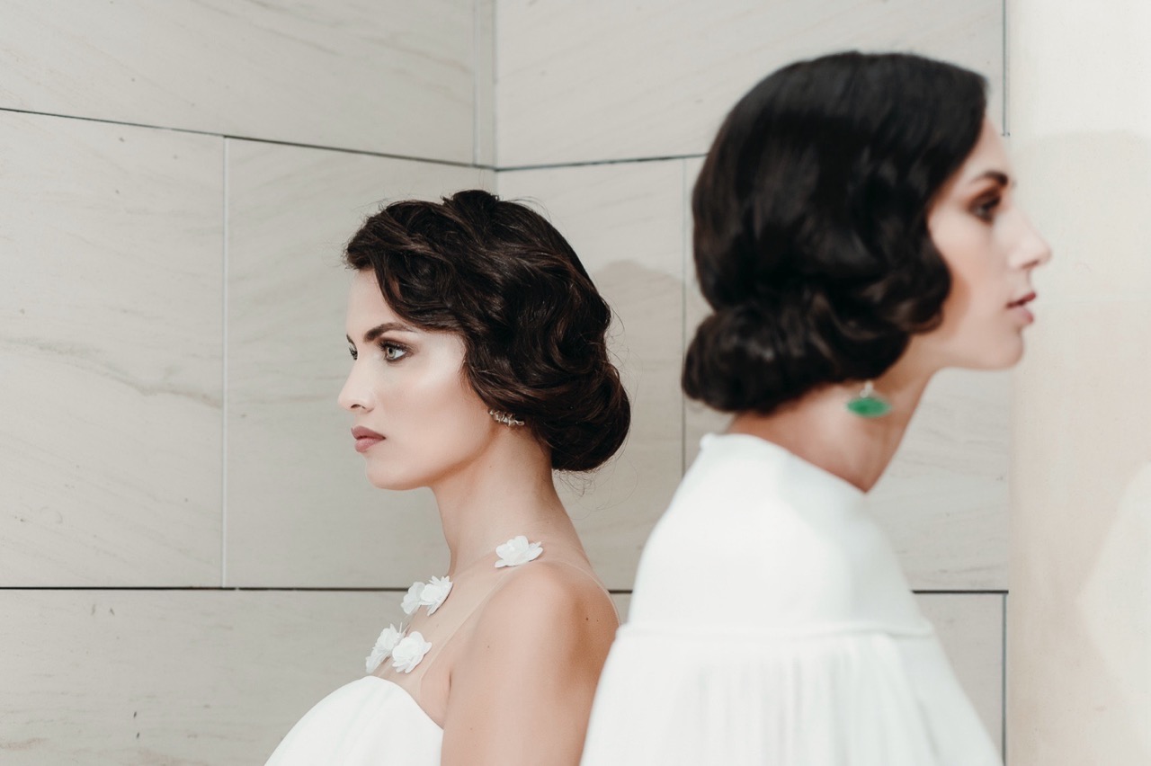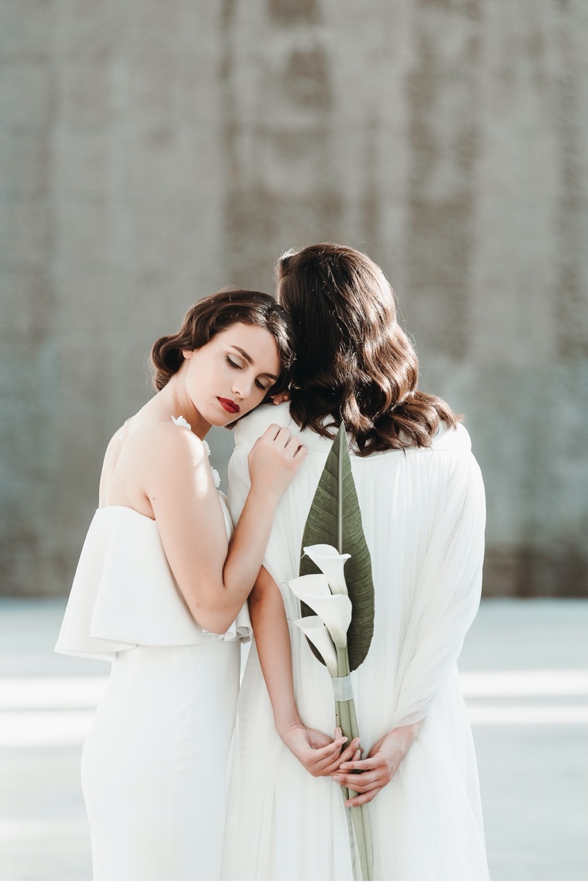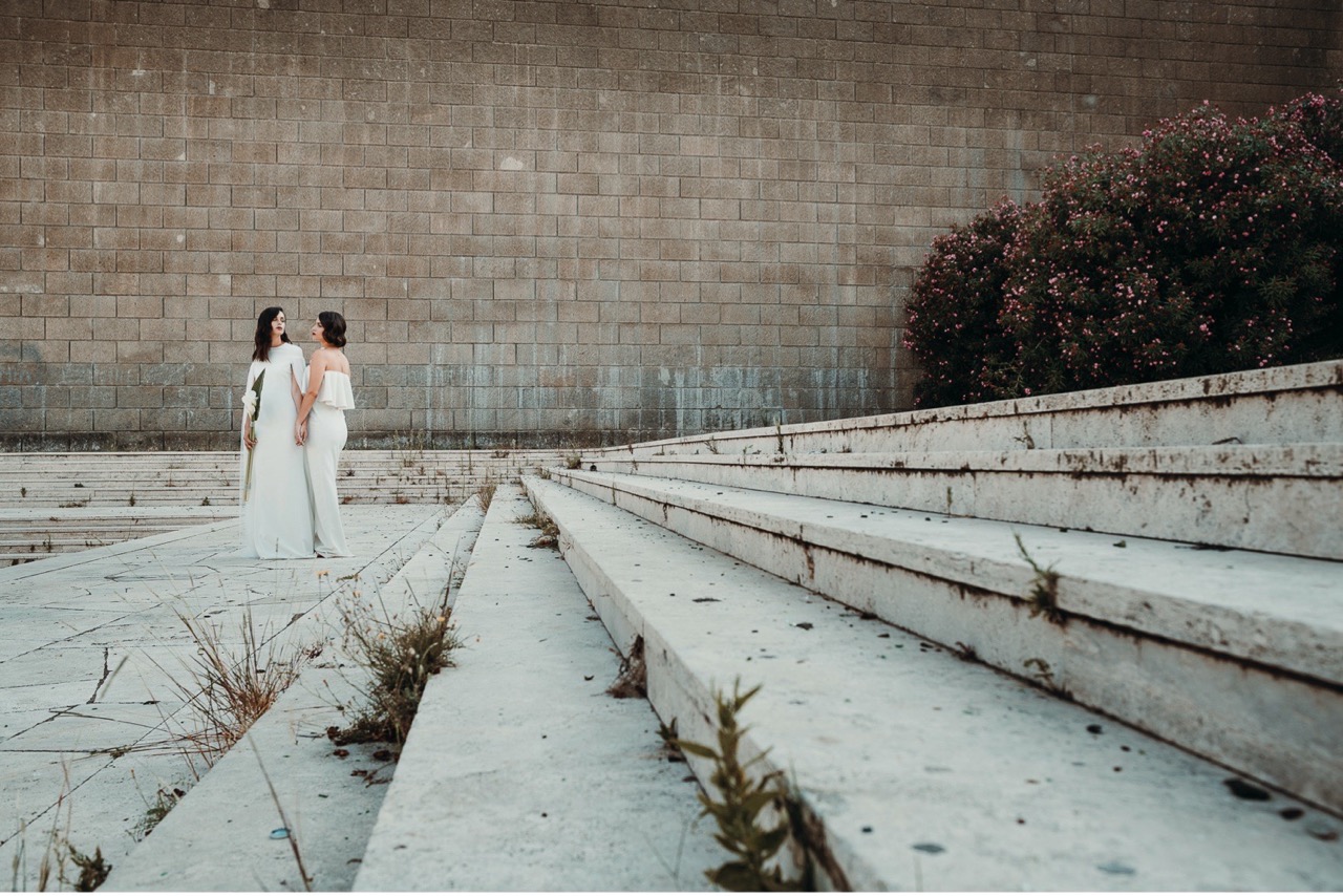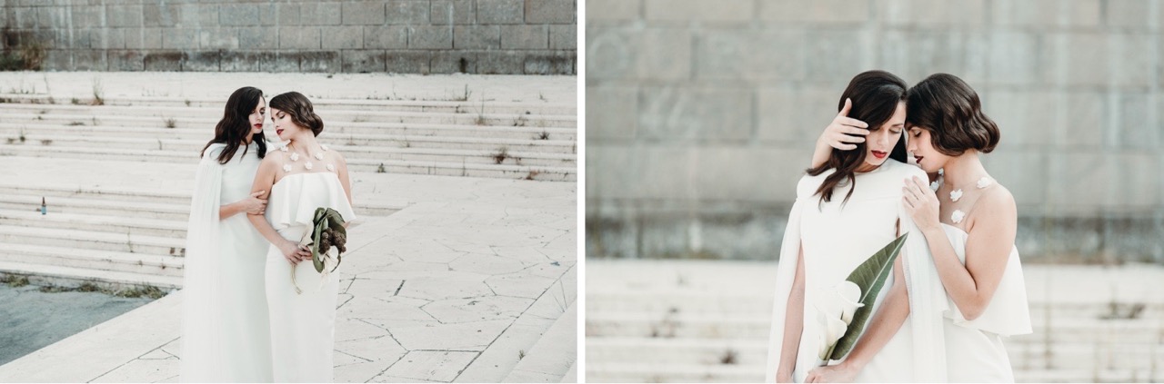 The two brides have retro hair and makeup designed and created by the talented Marianna Zambenedetti. Skin stands out with the bright red of the lips which fades and becomes natural in the interiors.