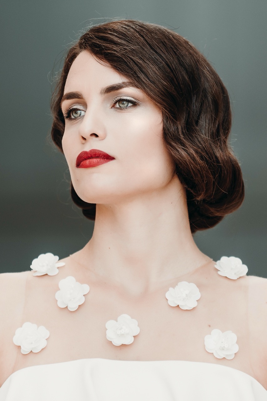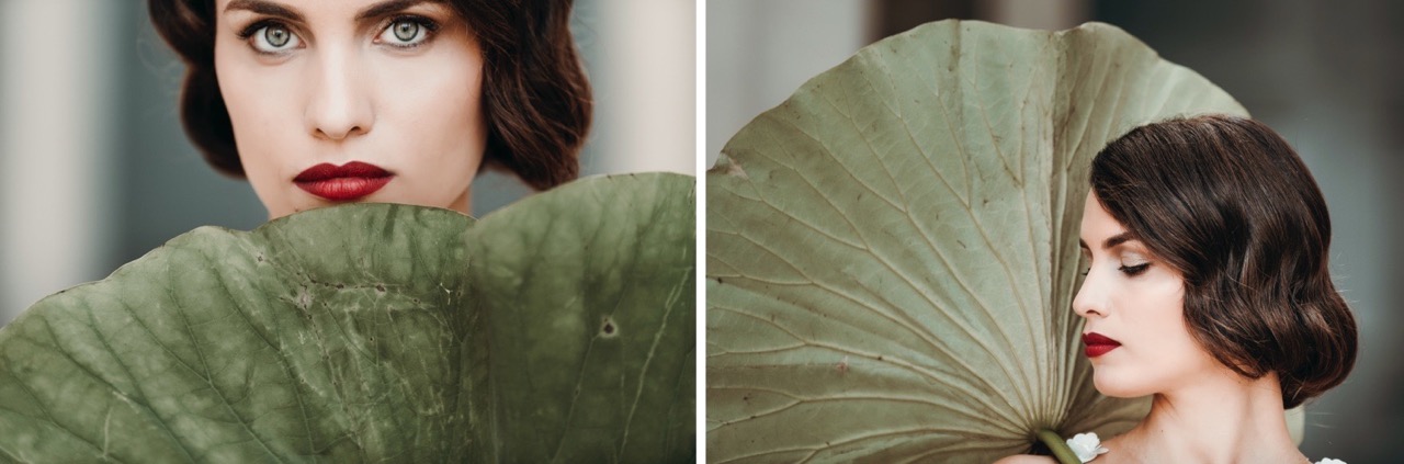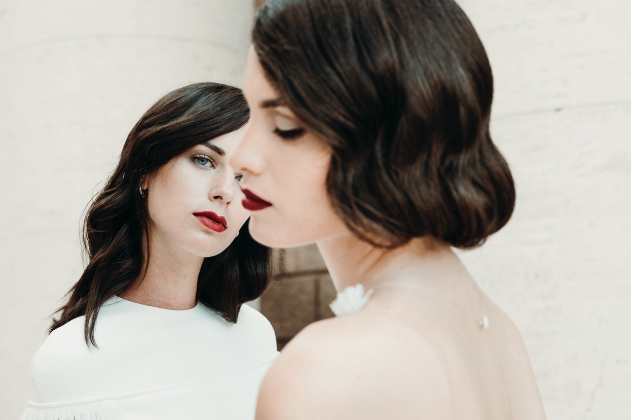 Le due spose hanno un trucco e parrucco retrò pensato e realizzato dalla bravissima Marianna Zambenedetti. La pelle chiara e luminosa risalta con il rosso acceso delle labbra che si attenua e diventa naturale negli interni.
