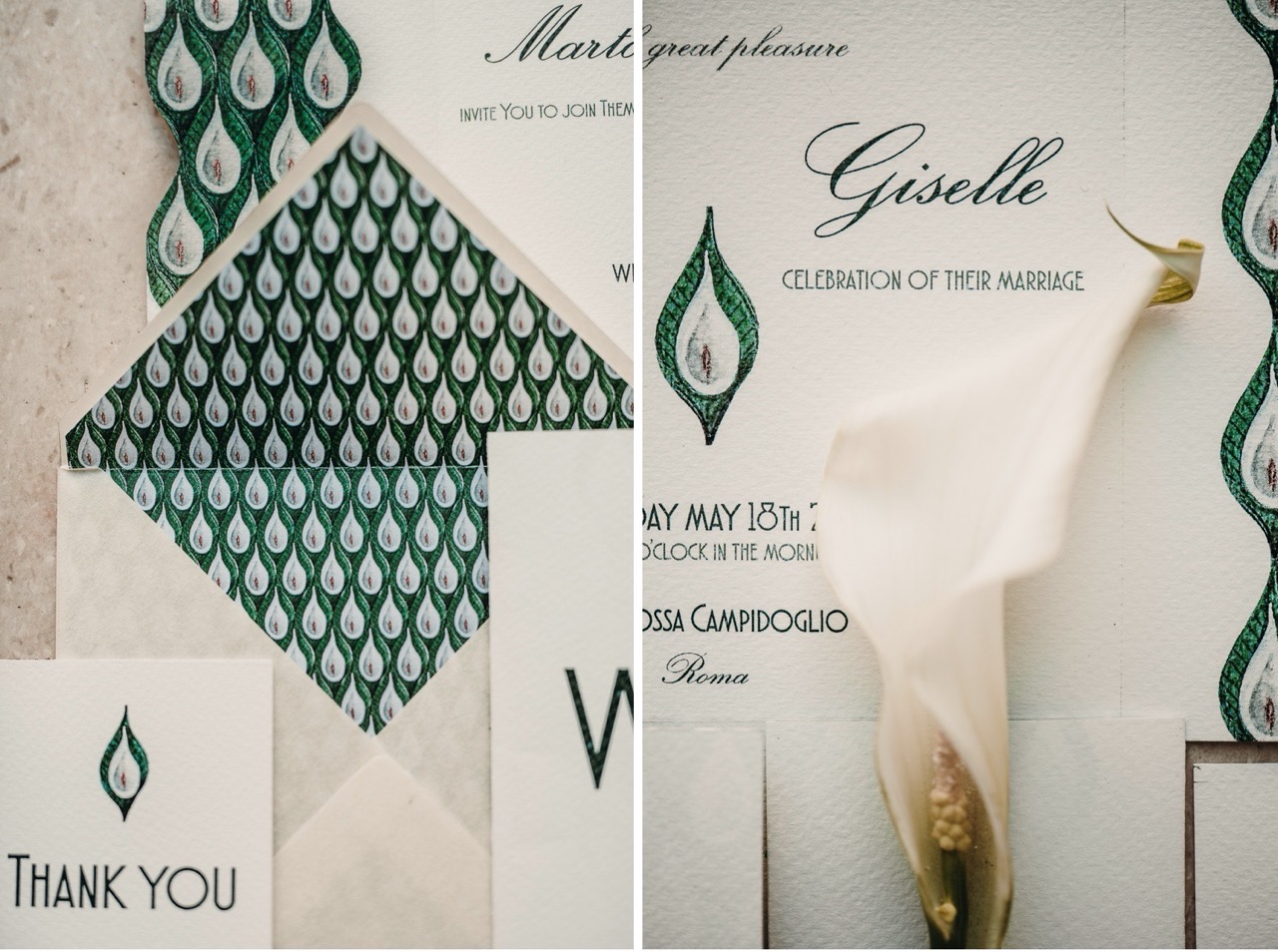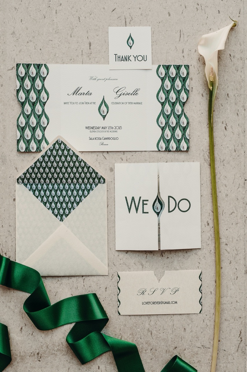La calla e foglia di sterlizia diventano un modulo che compone il pattern dalle linee sinuose della stationary. Anche qui ritroviamo le forme geometriche nelle linee e nel taglio. Per la scelta della carta due tipologie a contrasto: la carta cotone bianca, martellata e la pergamena beige trasparente.