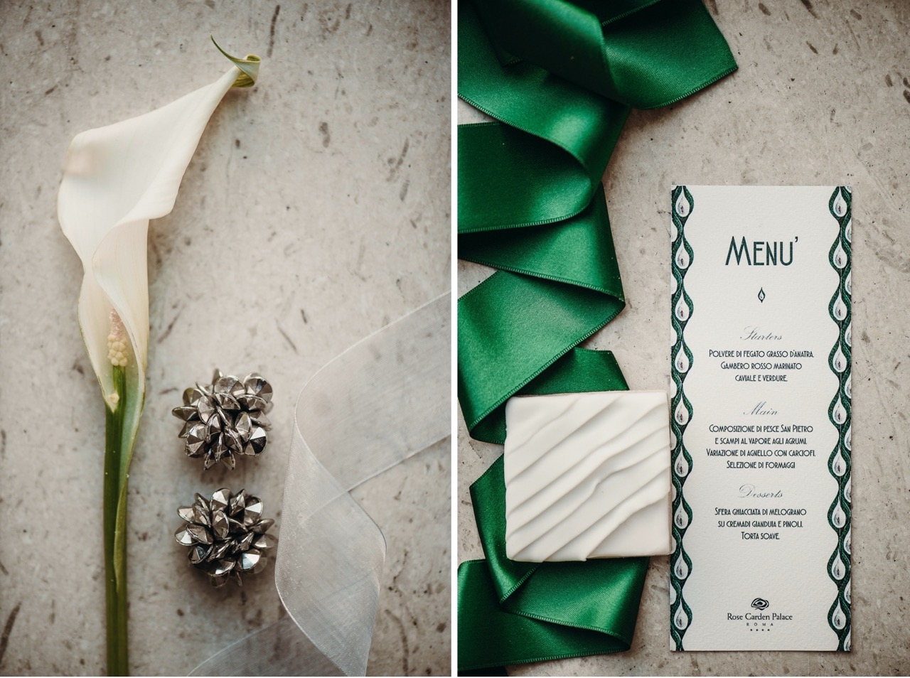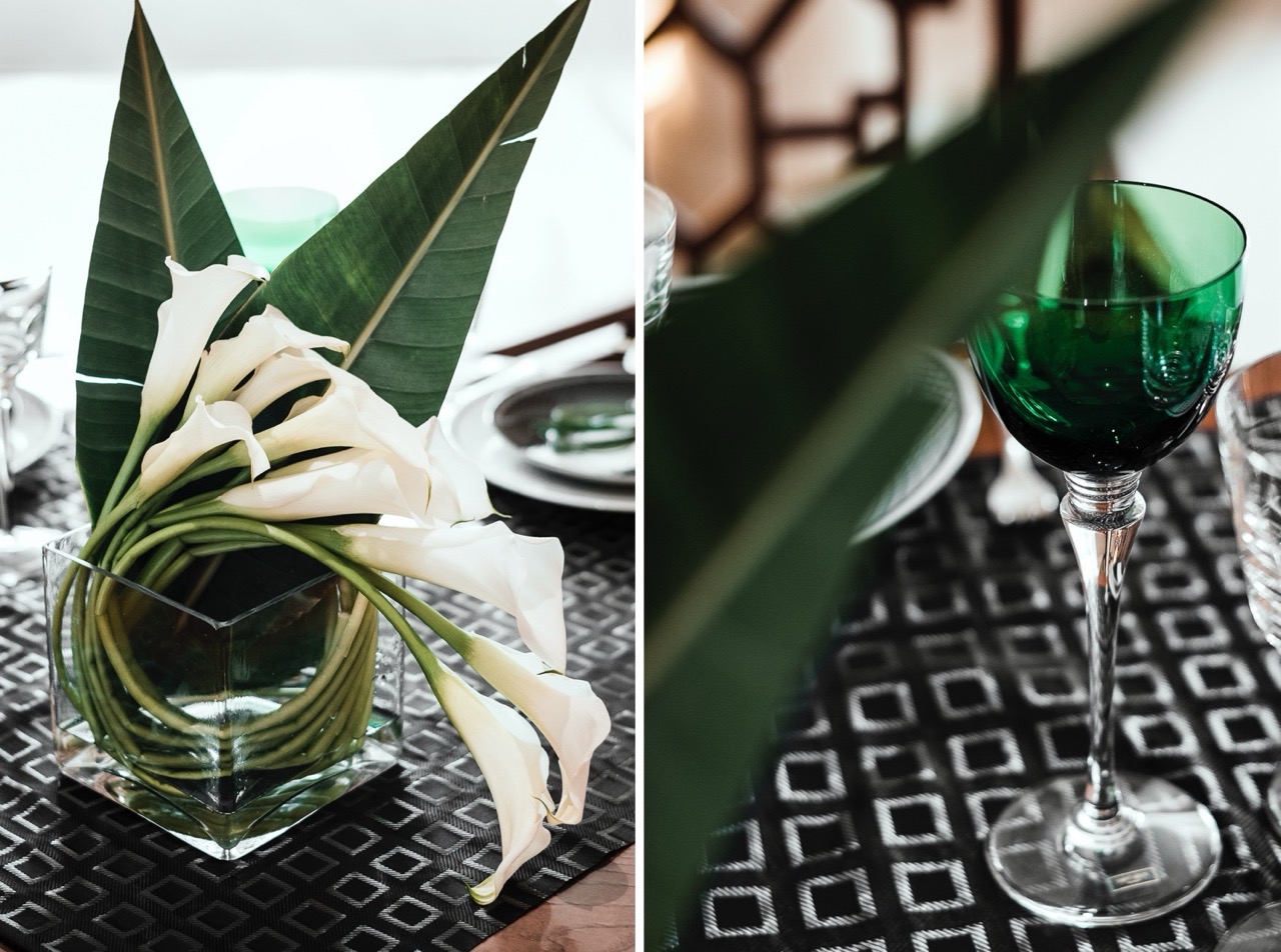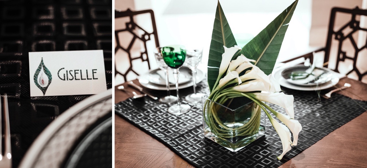 Questa contrapposizione di forme la ritroviamo nei due bouquet: il primo di calle e foglie di sterlizia, affusolato come una poetica lancia, il secondo tondo composto da una foglia di loto semplice o che accoglie delle piccole calle.