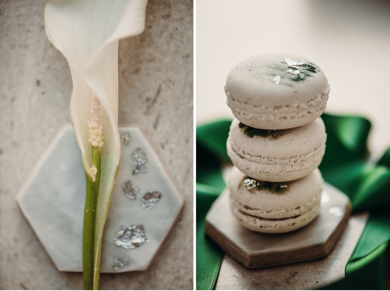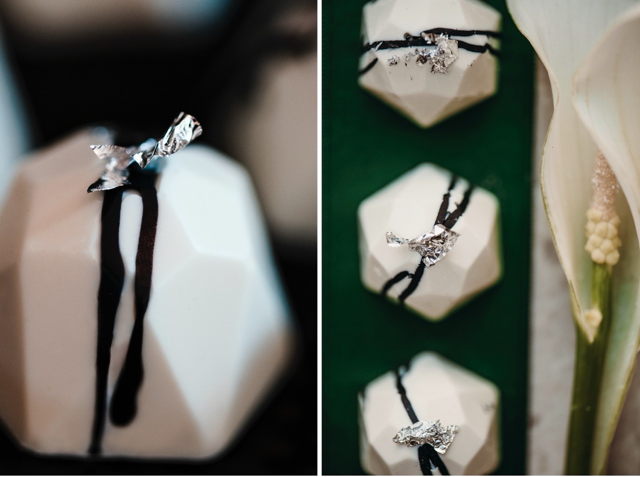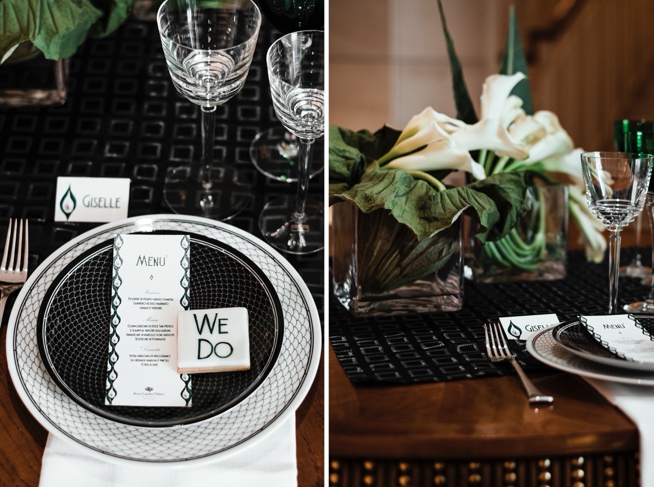 Questa contrapposizione di forme la ritroviamo nei due bouquet: il primo di calle e foglie di sterlizia, affusolato come una poetica lancia, il secondo tondo composto da una foglia di loto semplice o che accoglie delle piccole calle.