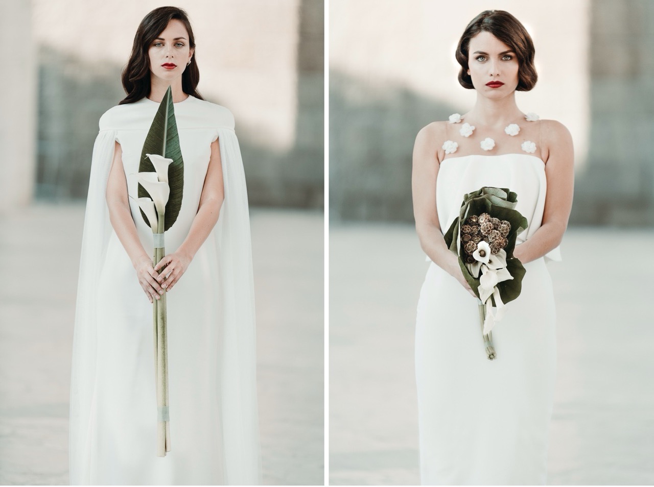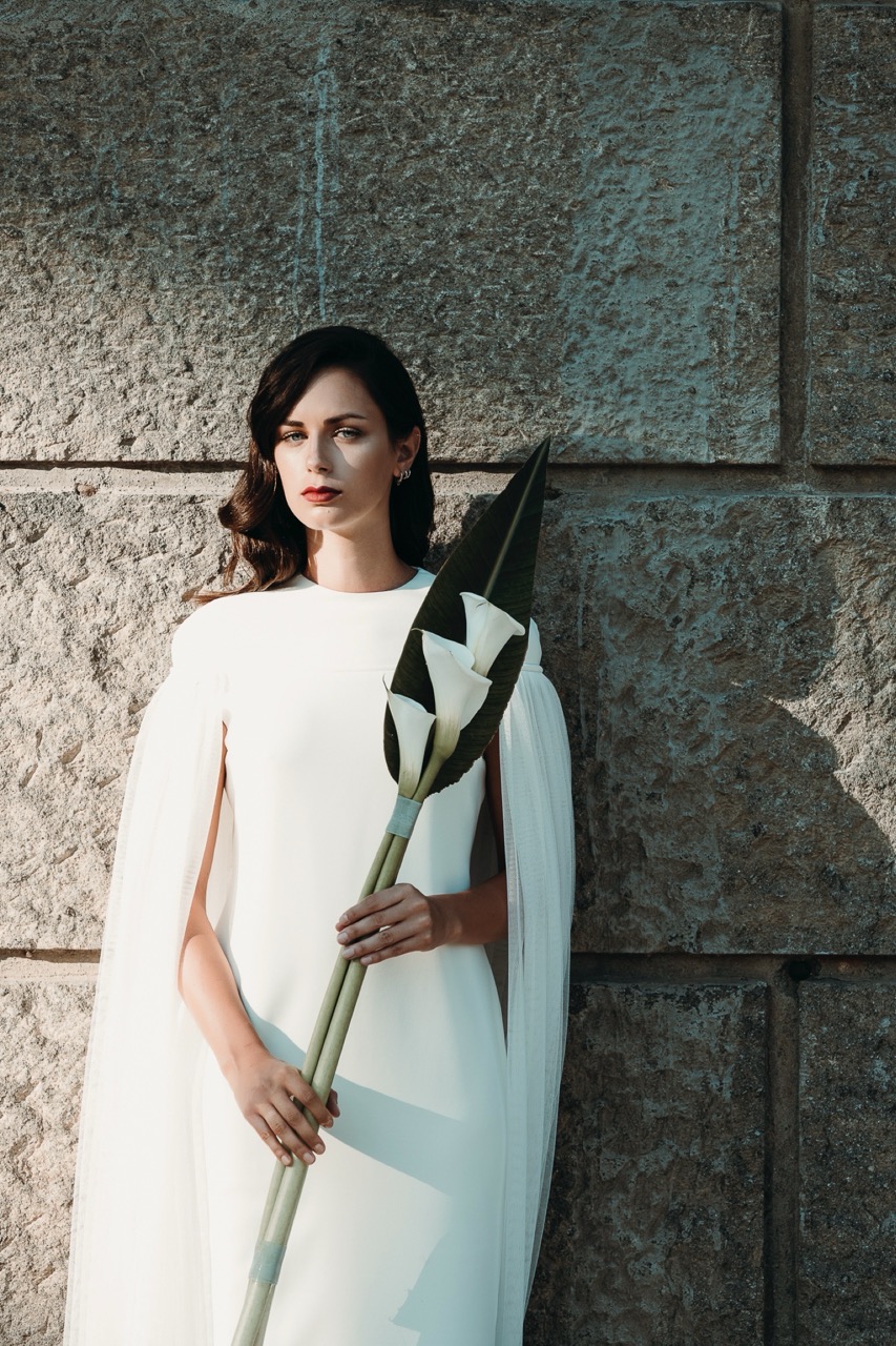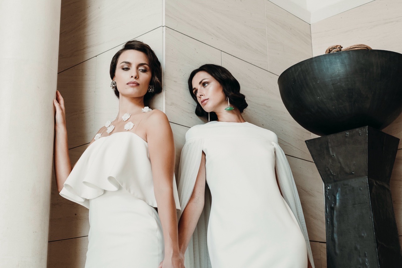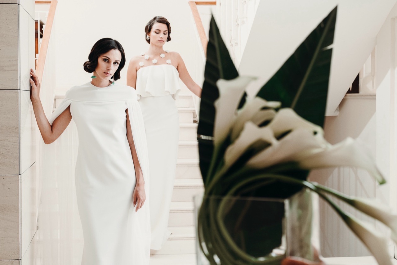 The dresses, both from the Spanish house Sophie et Voilà, are inspired by architecture, and combine an ultra-modern style with a retro sensitivity where curves and straight lines blend, inspiring a collection for avant-garde women. Each dress is a unique handmade creation and combines exclusive patterns with natural fabrics.