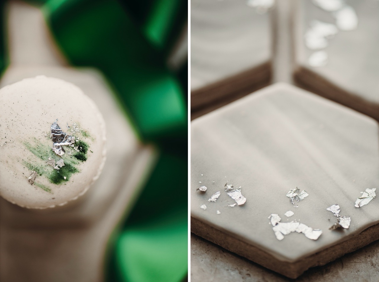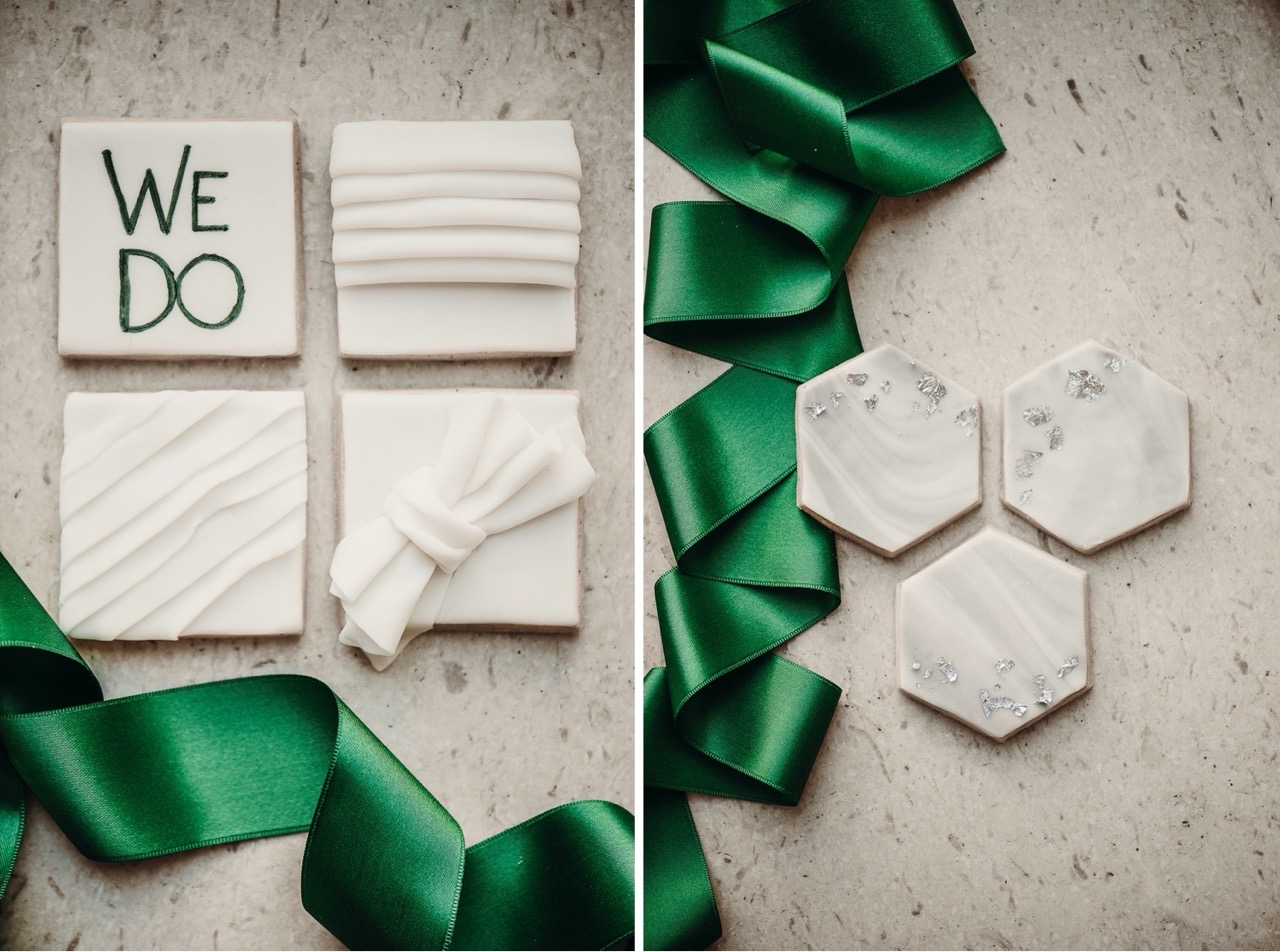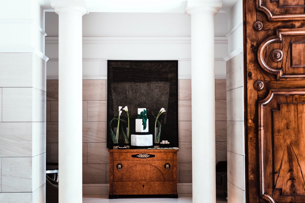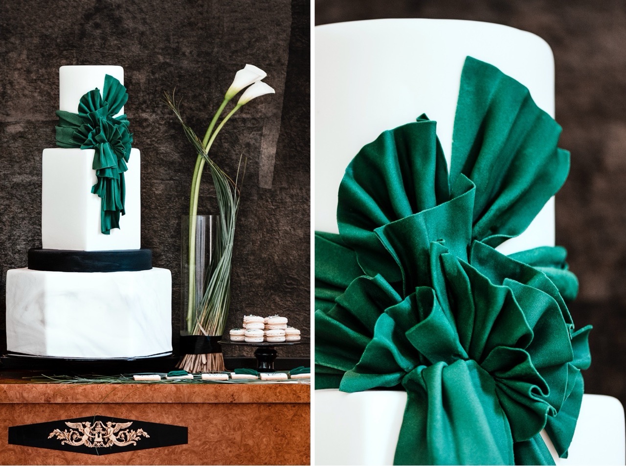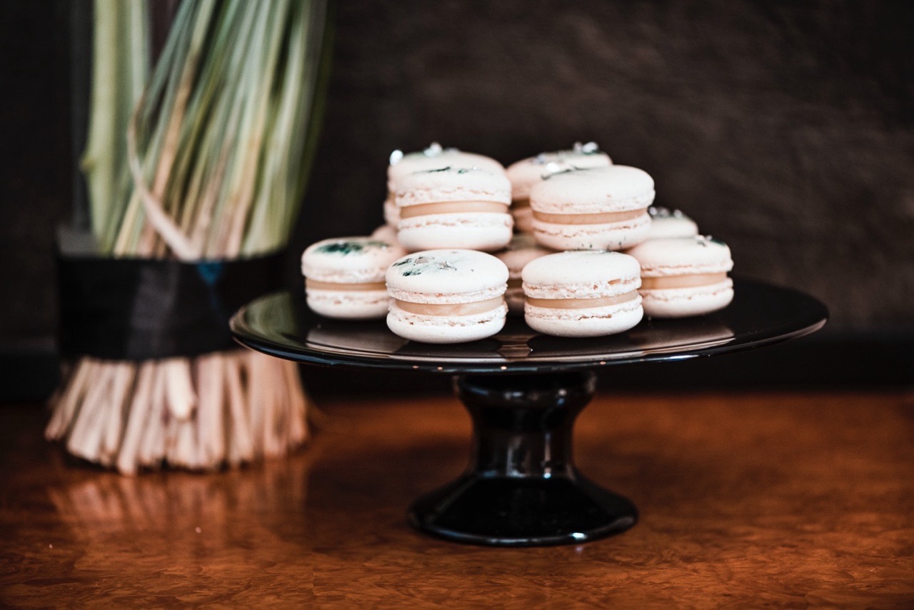 La torta maestosa della cake designer Annika Toni è la protagonista dello sweet table con la sua struttura geometrica imponente. E ’decorata con riferimenti espliciti ai dipinti di Tamara, mentre macarons e biscotti glassati riportano una decorazione ricercata, più leggera e coordinata con tutti gli altri elementi del matrimonio.